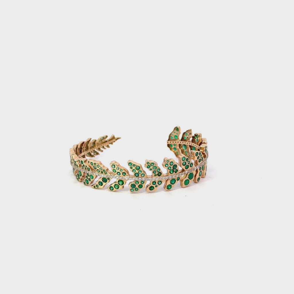 Crafted from 23.582 grams of 14k yellow gold, this Petite Fern Cuff Bracelet showcases a delicate fern leaf design, enhanced by 0.99 carats of diamonds and 7.5 carats of emeralds, combining elegance with a touch of nature’s charm.